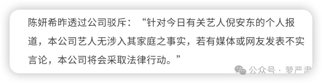 当时,陈妍希和刘香慈都是正面否认了的。 顺便,2018年4月,倪安东就办完离婚了。她的前妻和倪曾出轨的音乐剧女演员达成和解。 2月倪安东出轨相关问题传到陈妍希头上, 3月就是东方卫视品质盛典。陈晓上台后主办方忽然播放了一段陈妍希的VCR,内容是陈妍希赞美陈晓《那年花开月正圆》演得好,但是陈晓似乎表情很冷淡。 但是几个月之后陈晓和陈妍希又开始撒糖了。包括双方相互发庆生微博、私下聚会照片也很亲密,这类。