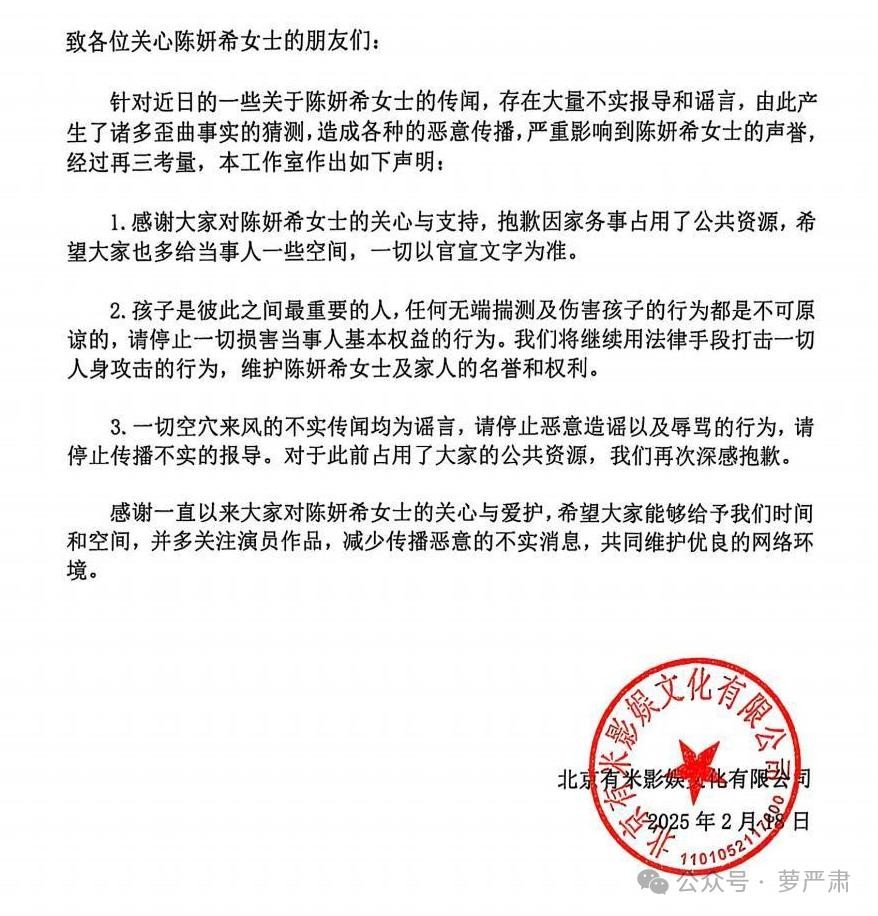 今天官宣离婚后,陈妍希工作室多发了一条声明,呼吁停止对陈妍希的造谣和辱骂,不要攻击孩子。