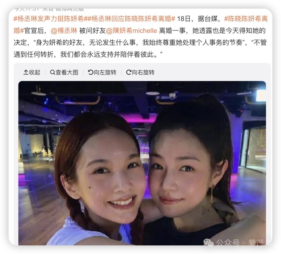今天陈妍希陈晓官宣离婚,陈妍希的好友杨丞琳则发布了自己一年前秘密办婚礼的照片,颇有些分担关注度的意思。