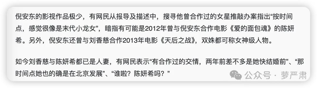 2018年2月,已经结婚八年有女儿的 倪安东 ,跟合作的音乐剧女歌手有婚外恋,倪的妻子告到法院,倪安东更多不忠于婚姻的信息被披露。台湾周刊报道,倪的妻子 在搜集证据时发现,倪安东除了音乐剧女歌手这个婚外恋情,婚姻存续期间还跟“女神级艺人”。其中“女神级艺人”的相关信息包括:两年前(2016年)倪与“女神级艺人”在北京有联系,倪的妻子要求和“女神级艺人”见面问话,对方说不方便,不会和倪再见面,自己快要结婚了。 女神、在大陆发展、2016年快要结婚,这几个信息就让舆论猜测是不是陈妍希。但另外一个高度疑似的是倪安东合作过的女艺人刘香慈。