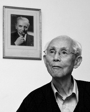 图为林家翘在清华住所的书房里,背后是导师冯·卡门的肖像。