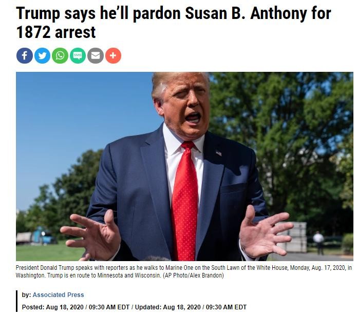 美联社:特朗普说他将赦免苏珊·安东尼,后者于1872年被捕