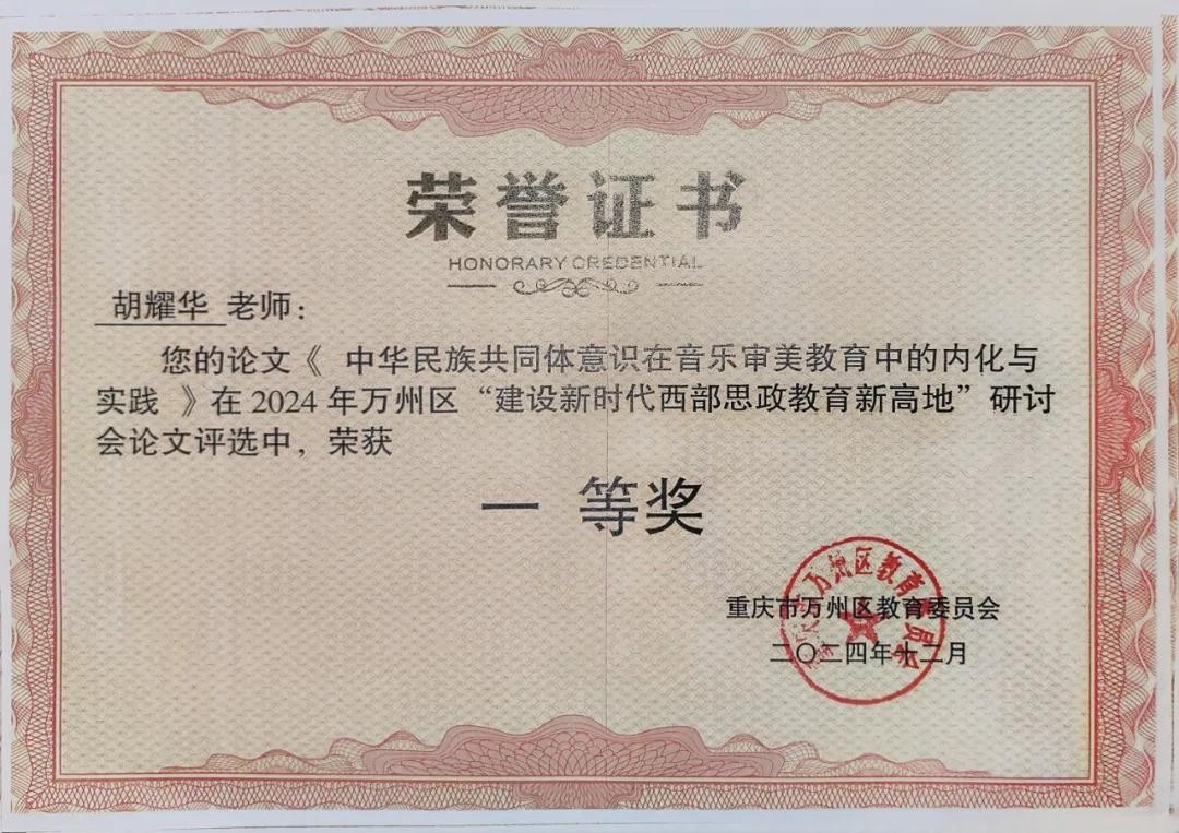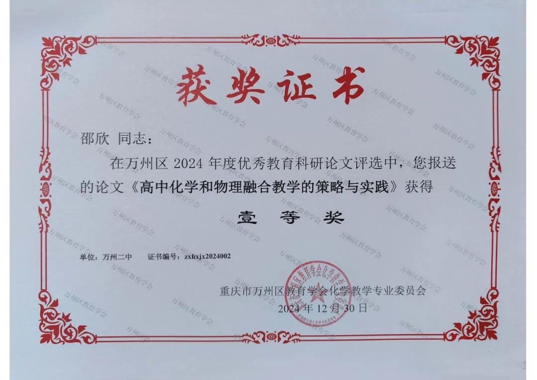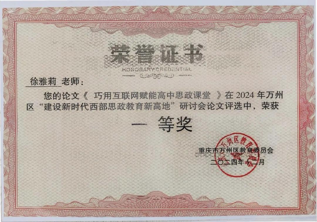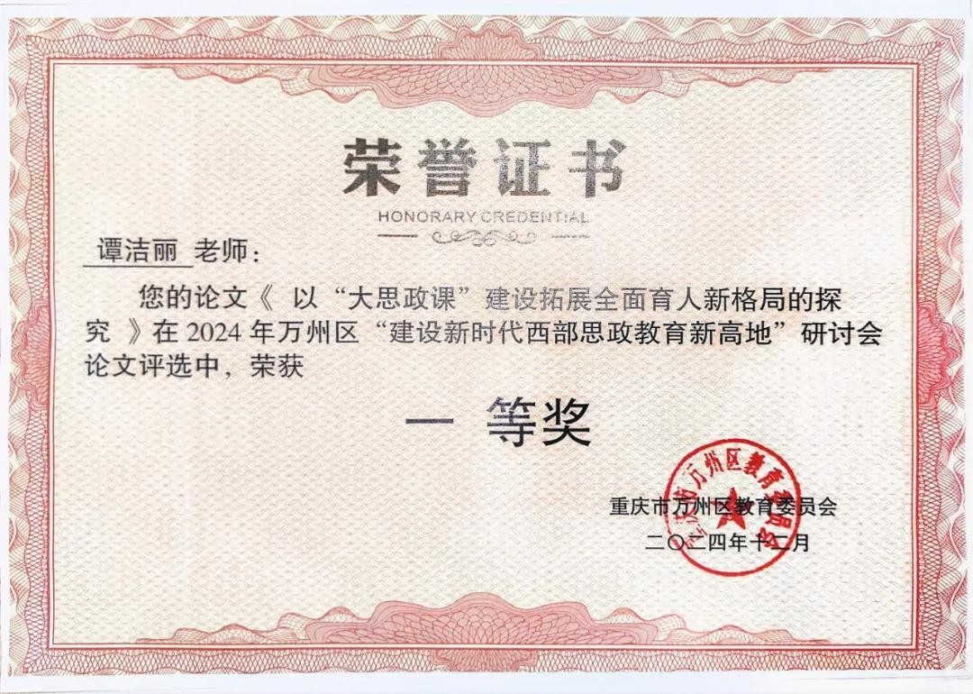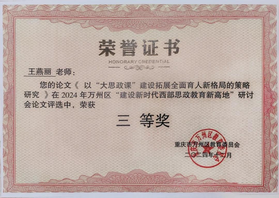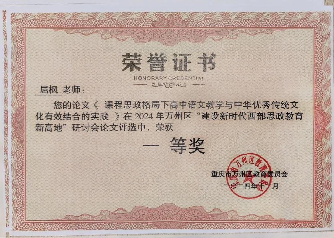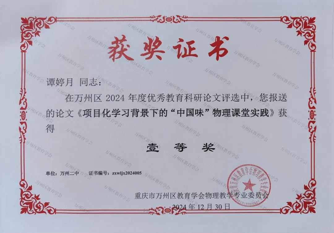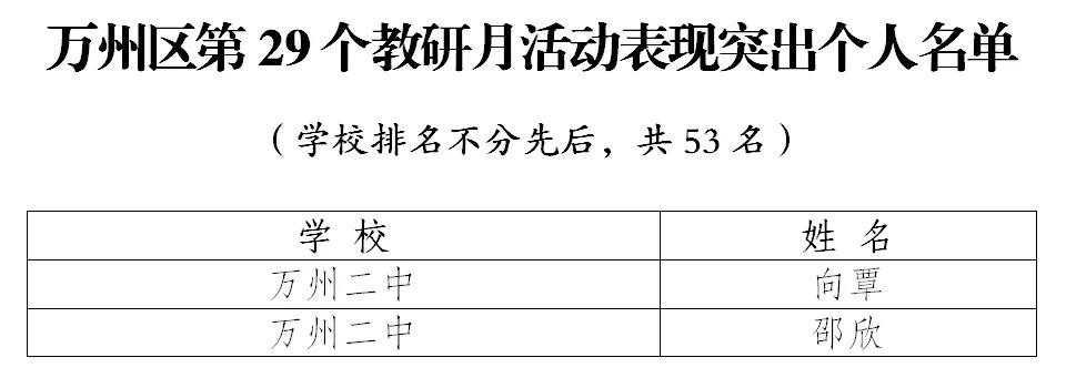 万州区第29个教研月活动表现突出集体及个人评选活动中,向覃、邵欣老师获评“表现突出个人”称号。