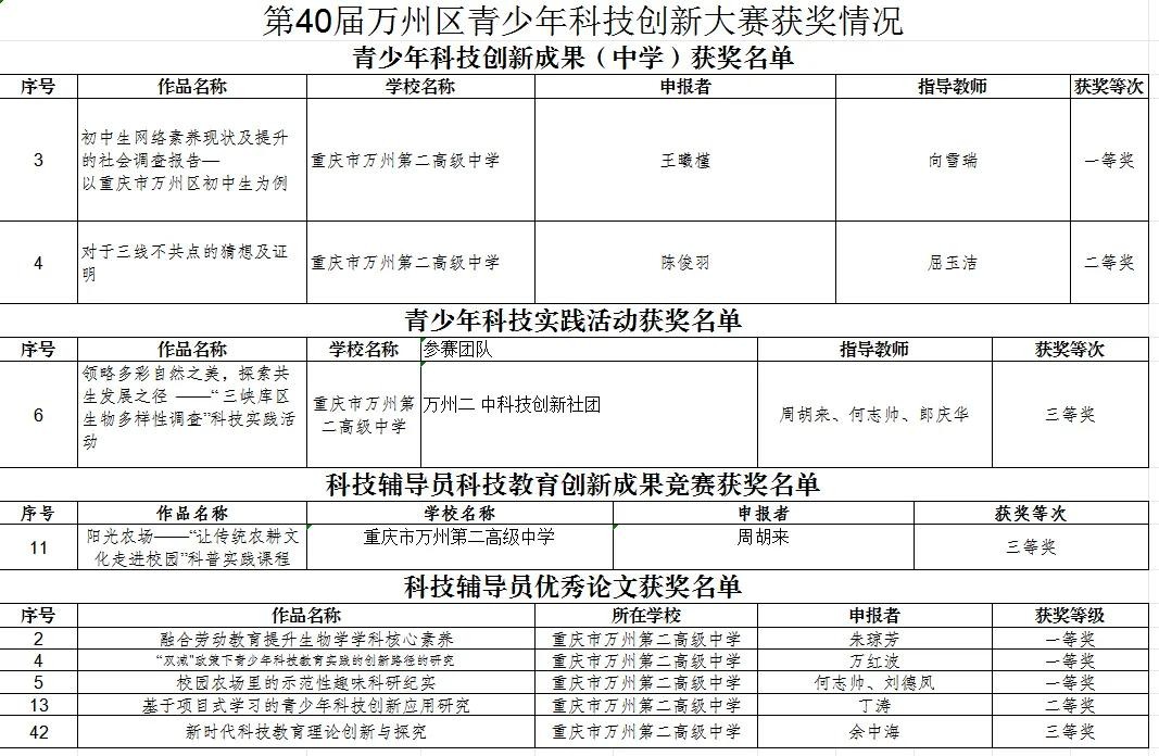 科技辅导员优秀论文比赛项目中,朱琼芳、万红波、何志帅和刘德凤四位老师的作品均荣获一等奖,丁涛老师荣获二等奖,余中海老师收获三等奖。青少年科技创新成果(中学)比赛项目中,王曦槿同学荣获一等奖;陈俊羽同学荣获二等奖。青少年科技实践活动项目中,我校科技创新社团的作品荣获三等奖。科技辅导员科技教育创新成果项目中,我校科技创新社团周胡来老师创作的作品荣获三等奖。
