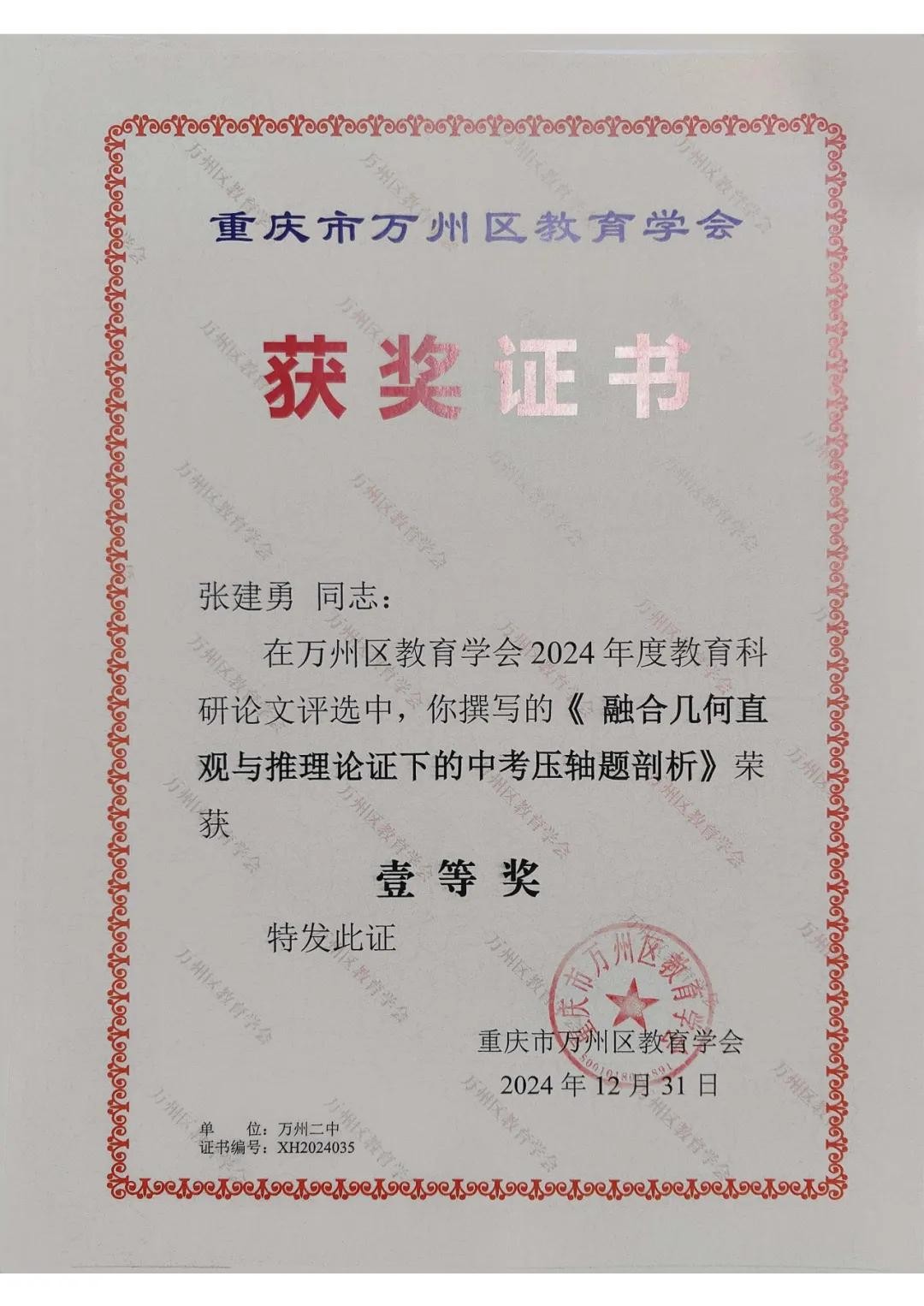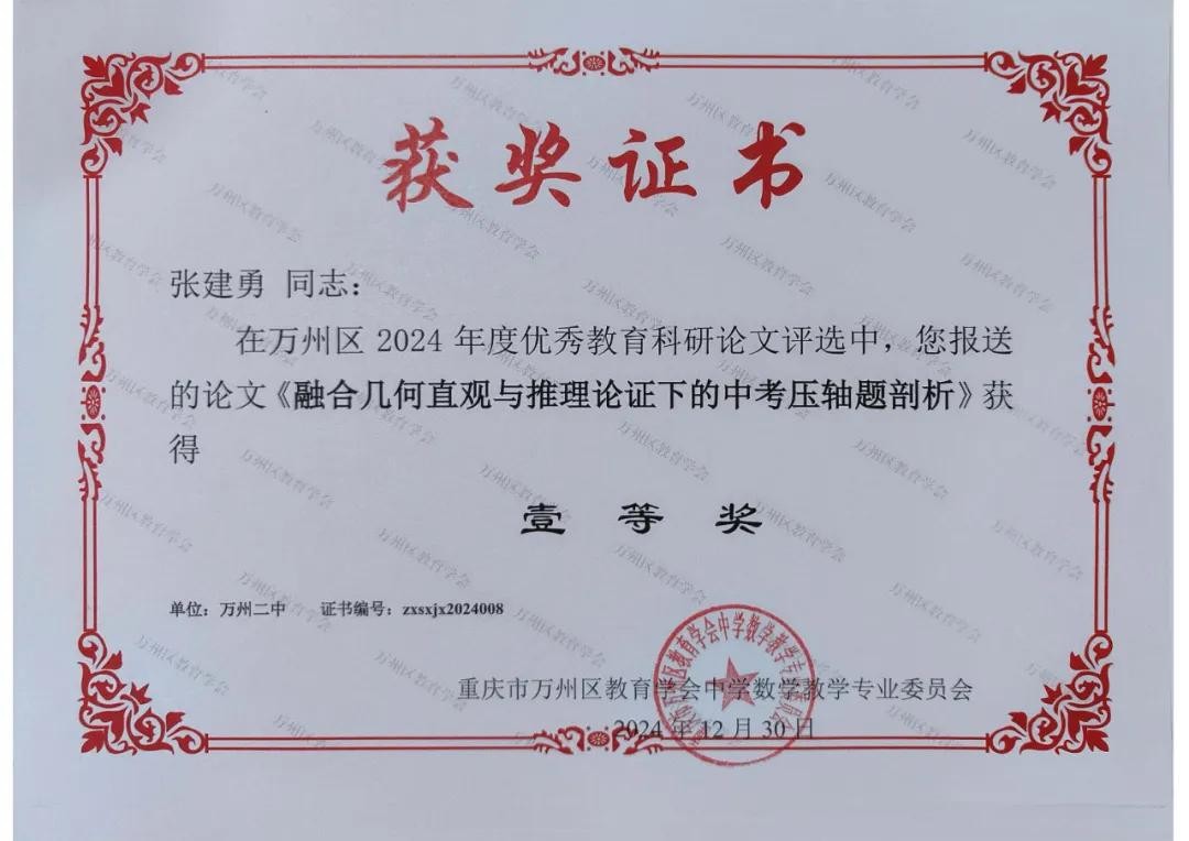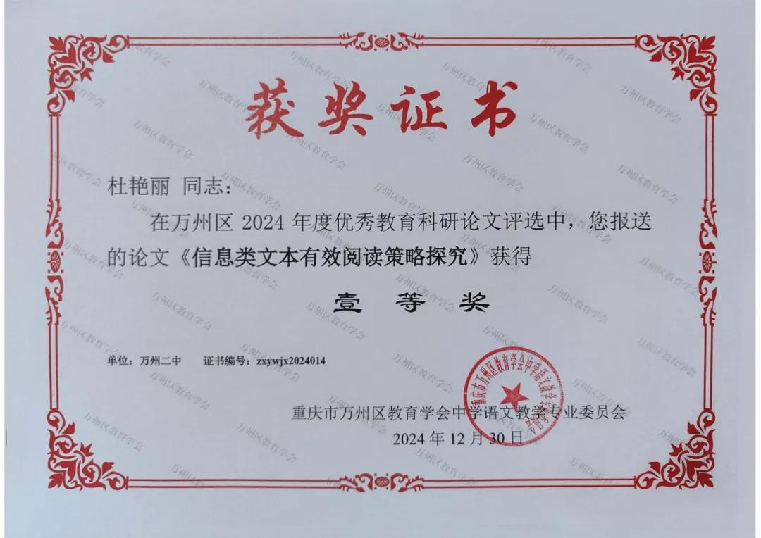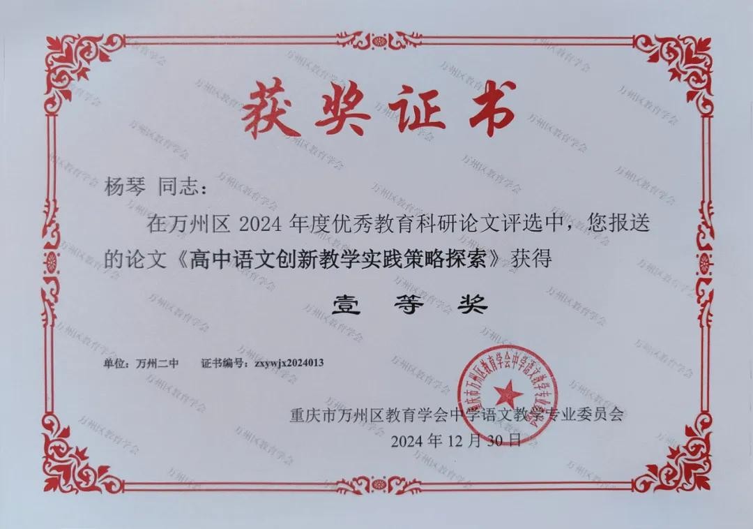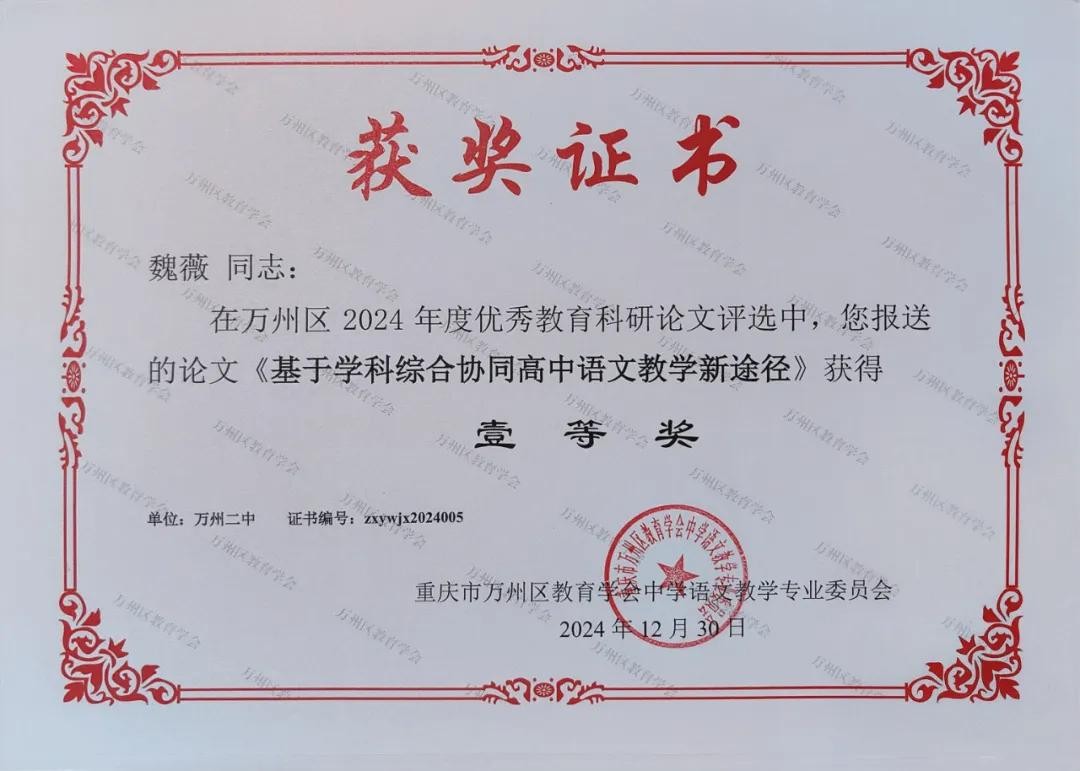 教育学会论文获奖5项,张建勇、胡耀华获一等奖,谭庆华、魏薇、谭婷月获二等奖;中学语文专委会论文获奖11项,魏薇、谭庆华、杨琴、杜艳丽获一等奖,何格、张欢、屈枫获二等奖,冯思睿、罗文昌、熊德绪、郎庆华获三等奖;中学数学专委会论文获奖2项,张建勇获一等奖,王刚获二等奖;外语教学专委会论文获奖6项,杨冬梅、陈伟、张小丽、张莉获二等奖,陈婧获三等奖;中学物理专委会论文获奖6项,谭婷月获一等奖,付张炼、夏蔡生、余璇获二等奖,丁涛、邓天虹获三等奖;中学化学专委会论文获奖7项,邵欣获一等奖,牟雄获二等奖,杜敏、万红波、陶春节、蒋梦华、何会梅获三等奖;中学生物专委会论文获奖2项,吴莉婷、童喻获三等奖;中学政治专委会论文获奖6项,谭燕、石小燕、严堰玲获二等奖,刘兴琼、程丹、应鸿愿获三等奖;中学地理专委会论文获奖4项,谢秋菊获二等奖,程致力、刘辉、黄钰容获三等奖;音乐教学专委会论文获奖2项,胡耀华获一等奖,何苗获三等奖;美术教学专委会论文获奖1项,陈丽娅获二等奖;德育专委会论文获奖2项,孟家友、骆朝霞获三等奖;心理健康教育专委会论文获奖2项,付晓林、谭涵方获三等奖;综合实践活动专委会论文获奖1项,周胡来获二等奖。