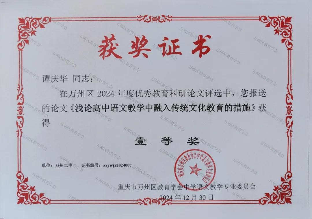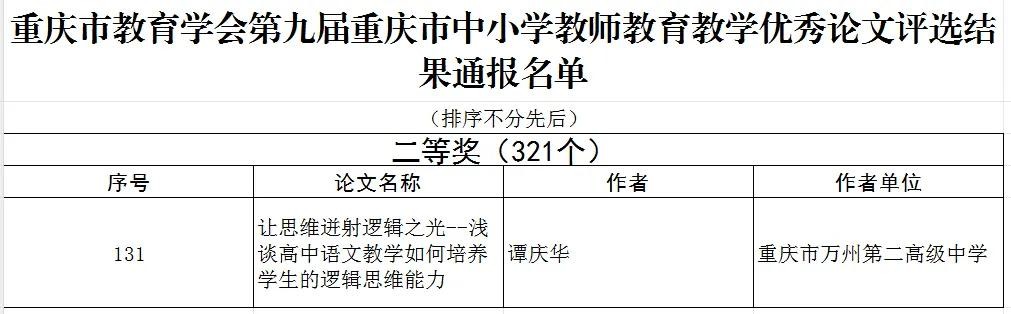 谭庆华老师论文《让思维迸射逻辑之光--浅谈高中语文教学如何培养学生的逻辑思维能力》获二等奖。