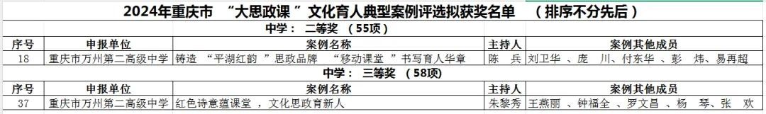 陈兵书记主持,刘卫华、庞川、付东华、彭炜、易再超参与的《铸造 “平湖红韵 ”思政品牌 “移动课堂 ”书写育人华章》案例获评中学组二等奖,朱黎秀校长主持,王燕丽、钟福全、罗文昌、杨琴、张欢参与的案例《红色诗意蕴课堂,文化思政育新人》获得中学组三等奖。