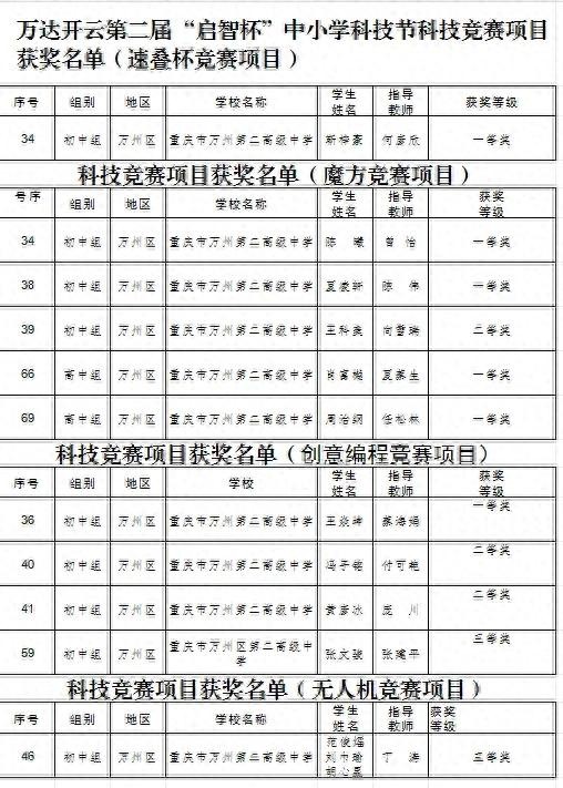 学校获评“工作突出组织单位”;何彦欣、夏蔡生、任松林、曾怡、陈伟、蔡海娟6位教师获评“成绩突出科技教师”称号;速叠杯竞赛项目获奖1项,学生靳梓豪(何彦欣指导)获一等奖;魔方竞赛项目获奖5项,学生陈曦(曾怡指导)、夏凌轩(陈伟指导)、肖富樾(夏蔡生指导)、周治纲(任松林指导)获一等奖,王科䶮(向雪瑞指导)获二等奖;创意编程竞赛项目获奖4项,王焱坤(蔡海娟指导)获一等奖,冯子铭(付可艳指导)、黄彦冰(庞川指导)获二等奖,张文骏(张建平指导)获三等奖;无人机竞赛项目获奖1项,范俊熎、刘巾瑜、胡心昱(丁涛指导)获三等奖。