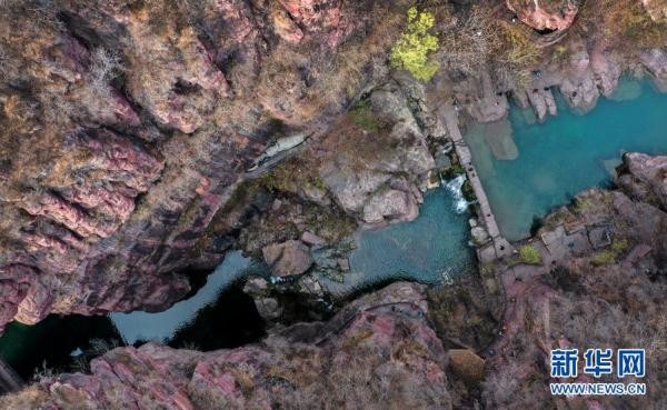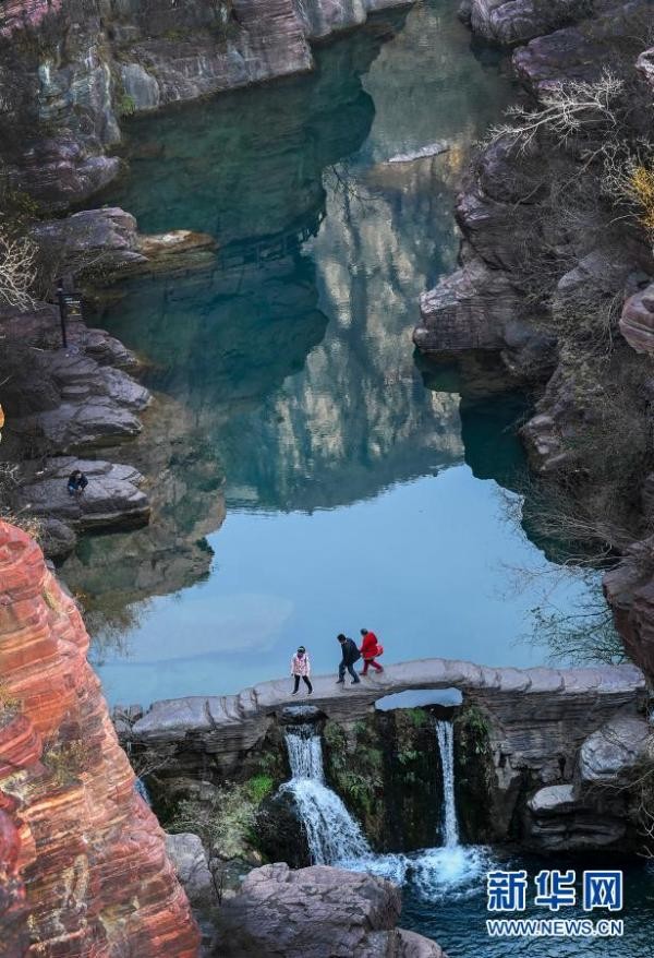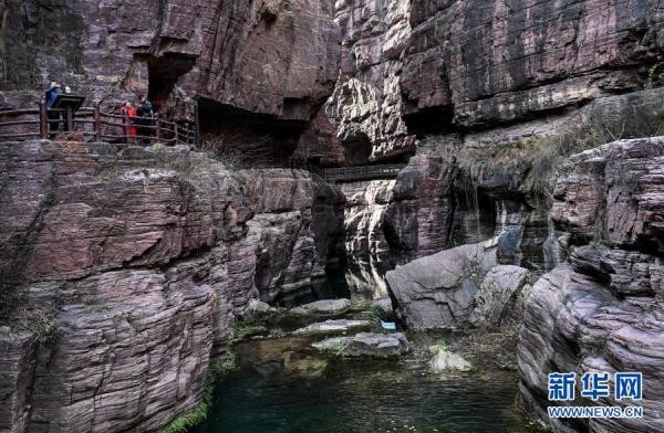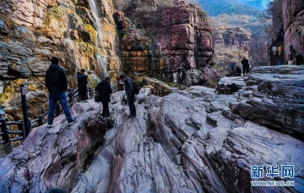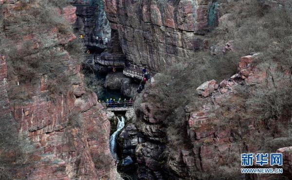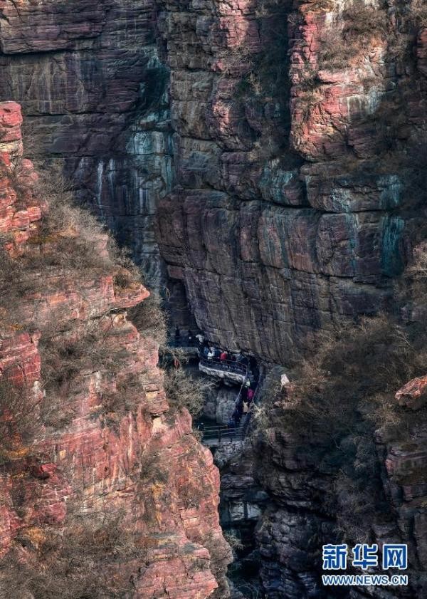 12月12日,游人在云台山风景区红石峡峡谷里游览。