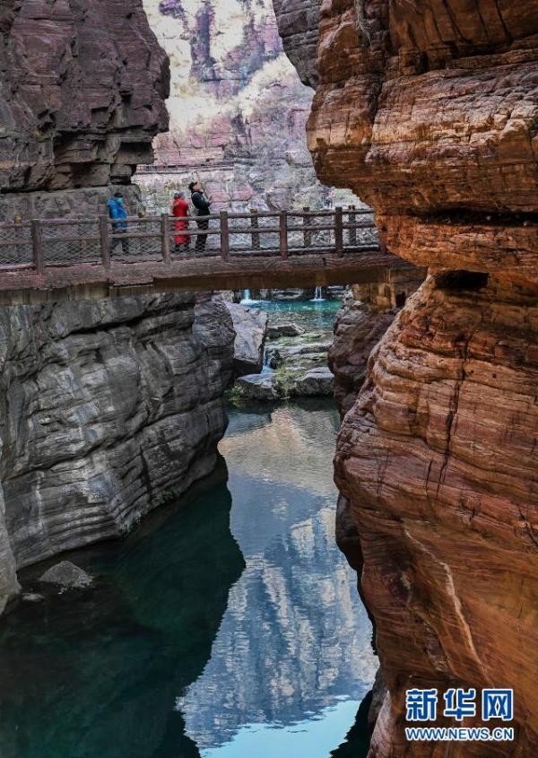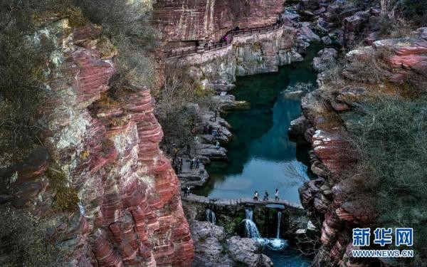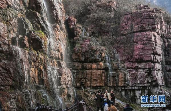 12月12日,游人在云台山风景区红石峡红岩绝壁前留影。