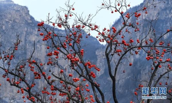 12月12日,红石峡上方挂满果实的杮树与云台山相映成趣。
