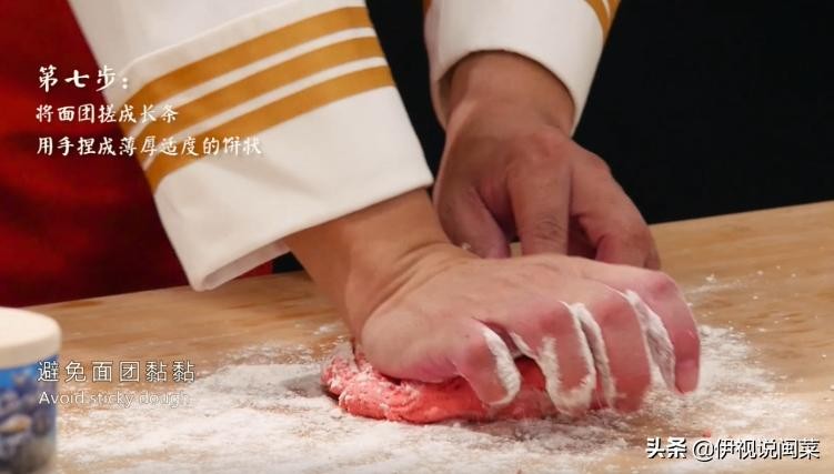 第七步:在案板上撒些面粉避免面团黏黏,将面团搓成长条,搓出一小部分,分成面剂子,用手捏成薄厚适度的饼状就成了红团皮。红团皮太厚了影响口感,太薄了容易破皮;
