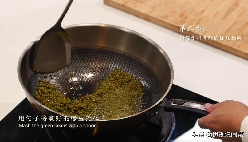 第三步:用勺子将煮好的绿豆捣碎,出锅备用;