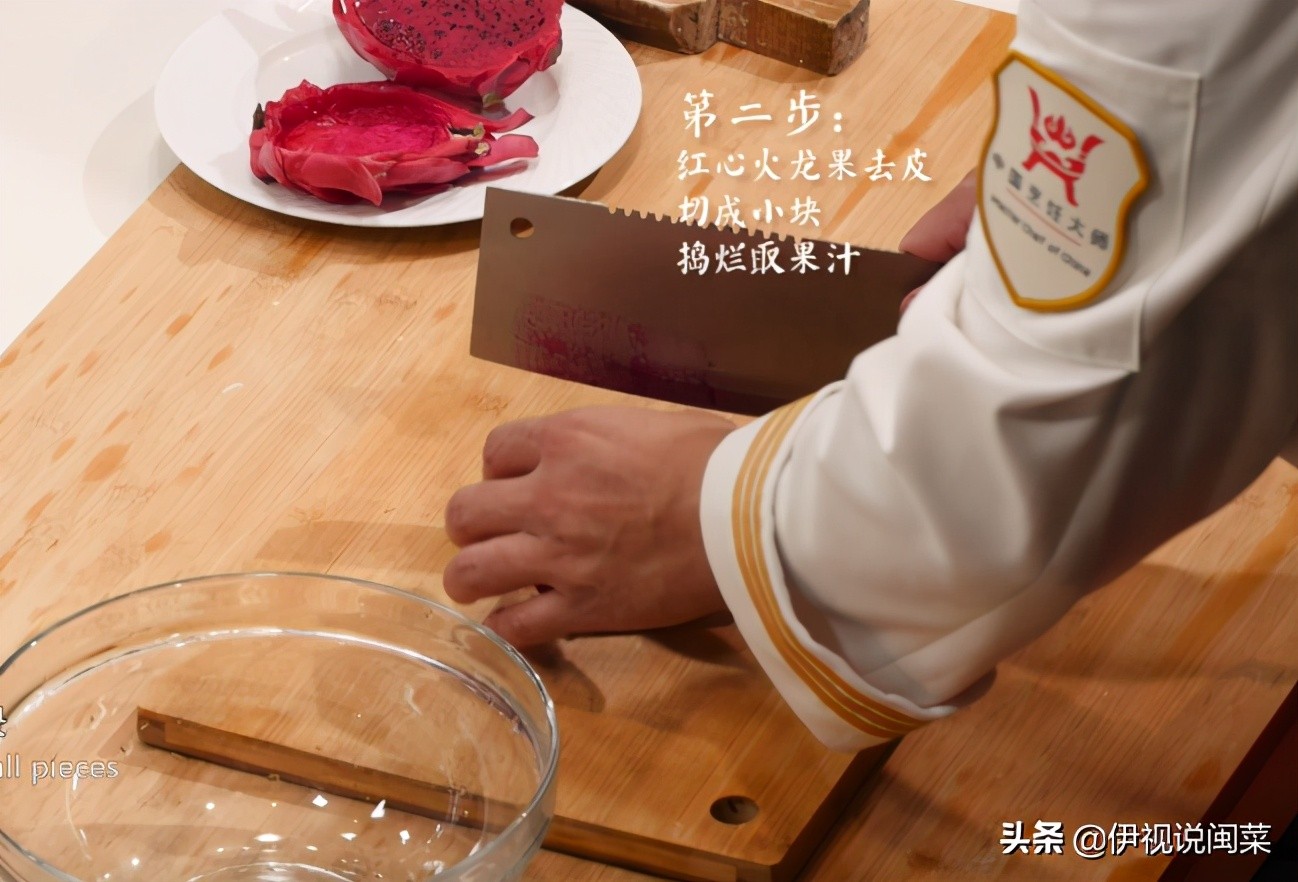 第二步:红心火龙果去皮切成小块,捣烂取果汁备用;