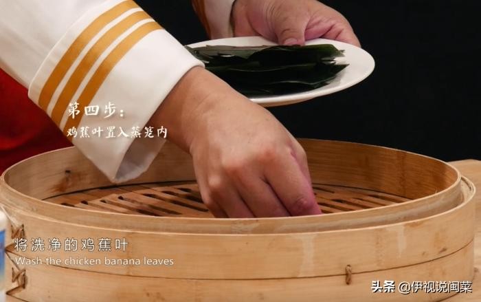 第四步:将洗净的鸡蕉叶置入蒸笼内,用鸡蕉叶蒸出来的红团外层有一种清甜的味道;