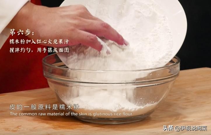 第六步:皮的一般原料是糯米粉,取适量的糯米粉加入备好的红心火龙果汁搅拌均匀,用手揉成面团,在案板上揉至不粘手备用