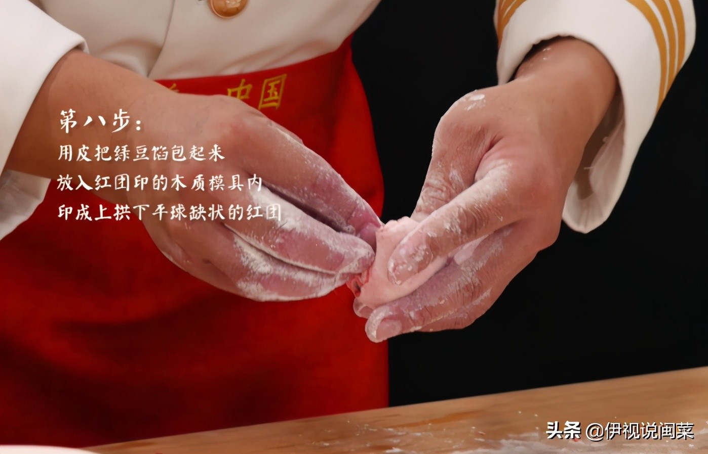 第八步:用皮把绿豆馅包起来,放入被俗称红团印的木质模具内,印成上拱下平球缺状的红团,曲面上花纹,中间一般印有福、禄、寿、喜、财、丁、贵及双孩儿、庆丰收等字样或图样;