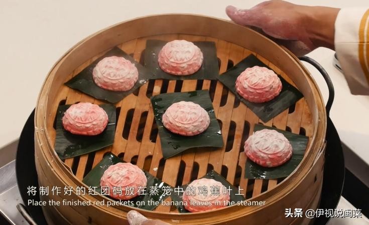 第九步:将制作好的红团放在蒸笼中的鸡蕉叶上,开火蒸15分钟即可。蒸熟后,打开蒸笼,红艳艳、香喷喷、亮闪闪的红团立刻呈现在眼前。