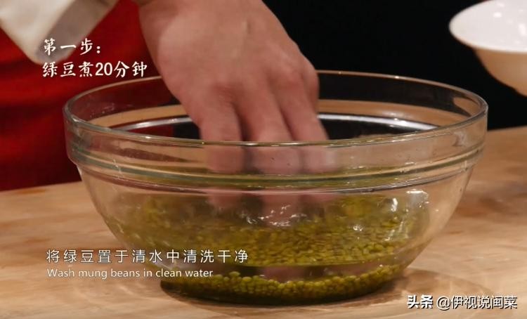 第一步:将绿豆置于清水中清洗干净下入锅中,加入适量白糖、清水煮20分钟至绿豆熟烂;