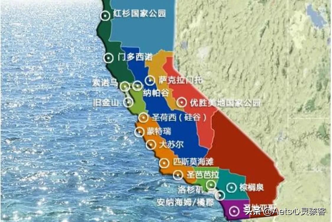 加利福尼亚位于美国西南太平洋沿岸,别名金州,州名起源于西班牙传说中的一座小岛。