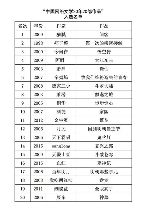 通过专家不记名投票,中国网络文学20年20部优秀作品·20名优秀作家推选结果如下: