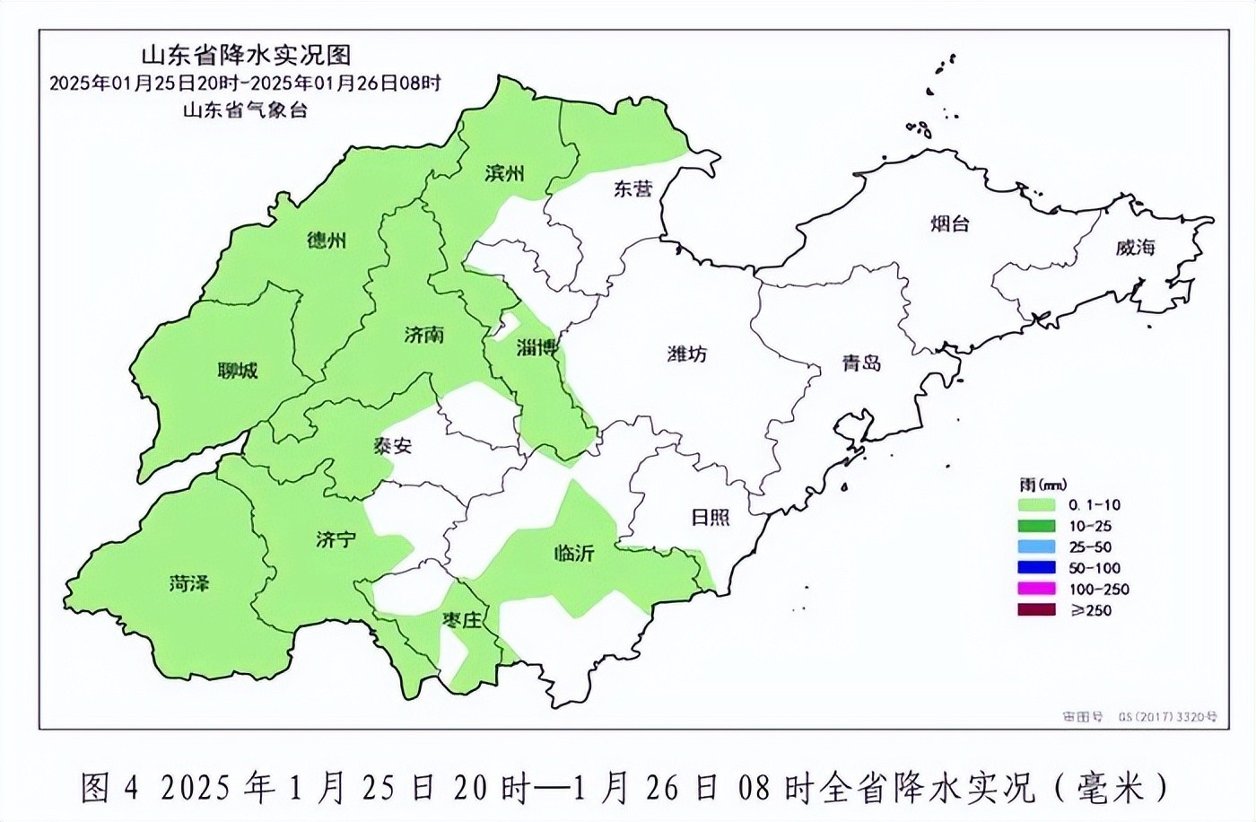 德州、聊城、滨州、济南、泰安、菏泽等市积雪深度1~3厘米,其中济南市区2厘米。