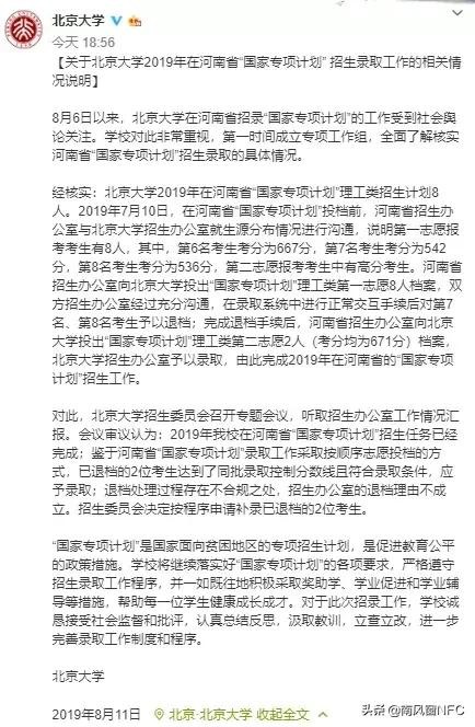 8月11日,北京大学发布了一份情况说明,宣布对之前在河南省的“国家专项计划”中被退档的两位河南考生按照程序申请补录。