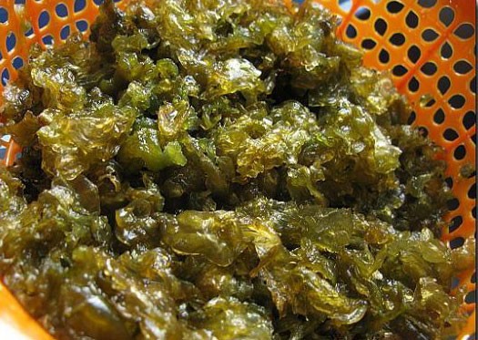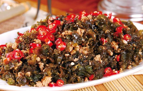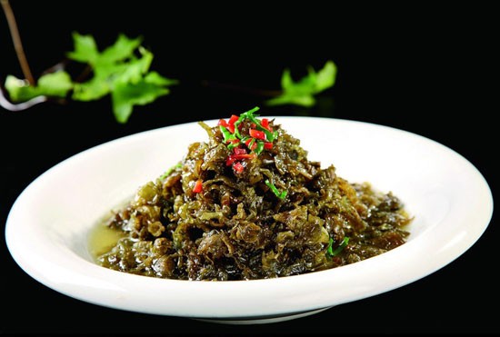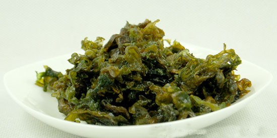1、将地皮菜洗净,去杂,入沸水锅内焯一下。