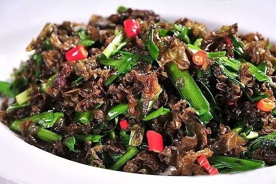 地皮菜是一种真菌和藻类的结合体,一般生长在阴暗潮湿的地方。由于片状较小,分布比较分散,要被人注意真的不容易。地皮菜又叫地耳、地衣、地皮菌、地瓜皮等,因为形状有点像泡软的黑木耳所有被叫为地木耳。本期红餐网食材档案就为大家介绍地皮菜。