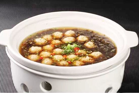 2、锅入水烧开,下入猪肉丸煮约10分钟至熟,放入地皮菜、粉丝,加盐、胡椒粉、生抽、香醋、味精调味,撒上香葱花、小米辣丁即可上菜。