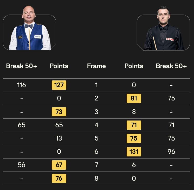 比赛首局,宾汉姆轰出了单杆破百116分,取得开门红。随后,塞尔比也不甘示弱,凭借单杆75分赢下第二局。第三局,宾汉姆三次上手得分,以73:8拿下该局,取得2-1领先优势。第四局,宾汉姆单杆65分,打丢关键超分球,塞尔比上手直接单杆71分实现单局逆转。随后,塞尔比连续打出单杆75分和96分,连下两局,大比分4-2率先取得赛点。关键时刻,宾汉姆毫不示弱,打出单杆56分,连续挽救2个赛点,比赛进入决胜局。决胜局,宾汉姆3次上手得分拿下该局,大比分5-4惊险逆转取胜晋级。