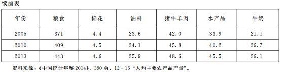 下面来看一下我国的实际情况。我国近几十年来人口增长迅速,作为一个人口大国,我国居民对粮食等农产品的需求是巨大的。表4—2和表4—3分别是我国在1978-2013年间主要农产品单位面积产量和人均主要农产品产量的统计表。