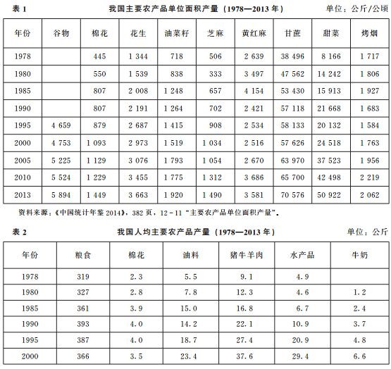 从技术层面看,农业新技术的不断涌现和应用,包括良种的研发及应用、农田基础设施的改善、农业机械的使用推广、 高效化肥和农药的广泛施用等等,都极大地提高了农业生产率。这些制度和技术因素的作用,最终具体表现为农产品的单位面积产量、总产量以及人均农产品产量的持续增加,从而满足了人们对农产品的需求。