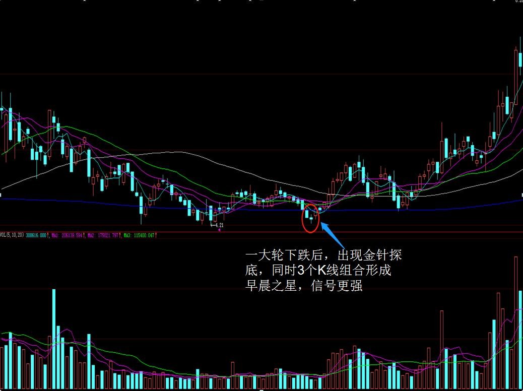 在K线中有一个看涨信号强烈的形态叫定海神针,指的是股价在经过一大波下跌之后,在某一天出现跳空低开低走,然后股价盘中开始上涨,表现在日K线上会出现一根长下影线。这根长下影线就像一根针一样支撑着股价不再下行,因此被称为是定海神针,它意味着行情将要由跌转升,是极为强烈的看涨信号。