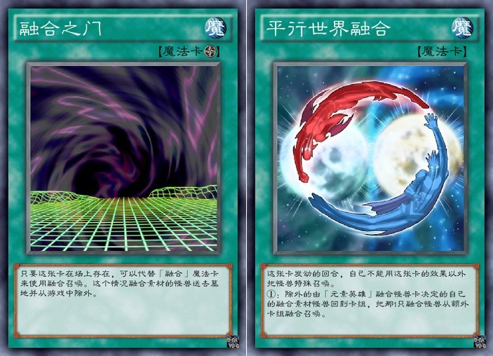 元素英雄卡组不建议投入「融合」与「奇迹融合」之类的,为了融合个怪兽还要多浪费一张手卡,很不值得。建议使用场地魔法「融合之门」+「平行世界融合」的组合,利用1张场地魔法就可以一直使用融合下去,而除外的怪兽用「平行世界融合」可以一回合再出一个融合怪兽。