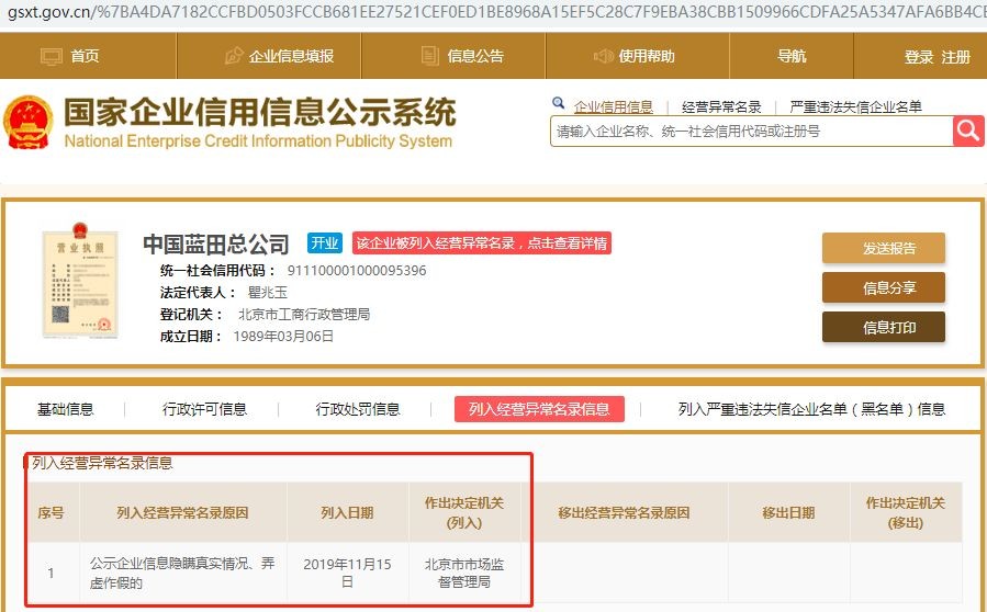 国家企业信用信息公示系统显示,11月15日,中国蓝田总公司(下称“中国蓝田”)被北京市市场监督管理局列入经营异常名录,原因是“公示企业信息隐瞒真实情况、弄虚作假”。