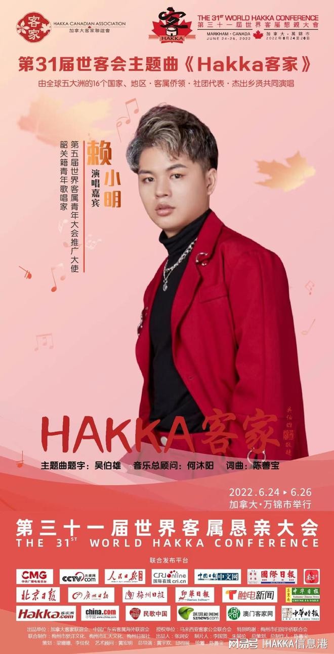 广东青年男高音歌唱家、韶关南雄籍客家人赖小明老师,因2019年在马来西亚举行第30届世客会的精彩表现,再次受邀演唱“世界客属第31届恳亲大会”主题曲《Hakka客家》。歌曲由著名客家音乐人、深圳市客语流行音乐协会副会长陈善宝担任创作人、总制作人。由中国国民党名誉主席吴伯雄提写歌名,全国政协委员梁亮胜担任荣誉顾问,中国音乐节协会副主席何沐阳担任大会音乐总顾问。