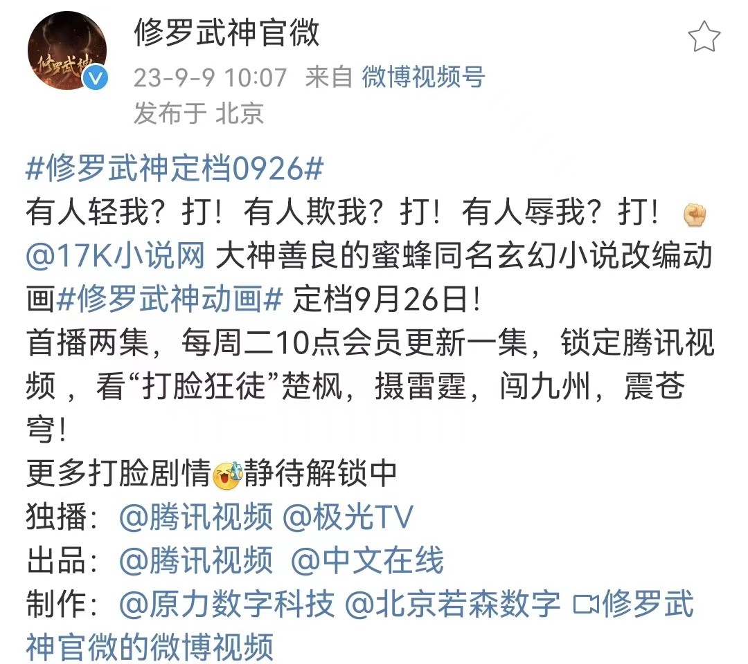 视频平台已定,不出意外乃是腾讯视频。毕竟现在国内百分之八十的动漫都是选择在腾讯视频播出,所以修罗武神在腾讯视频这个平台在我个人看来再正常不过,去别的视频平台那才不正常,那样只怕修罗武神播完了都没几个人知道。