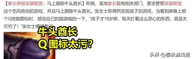 传言,一位家长偶然发现孩子玩游戏,牛头酋长的Q技能图标太“污”了,遂请求删除牛头酋长。