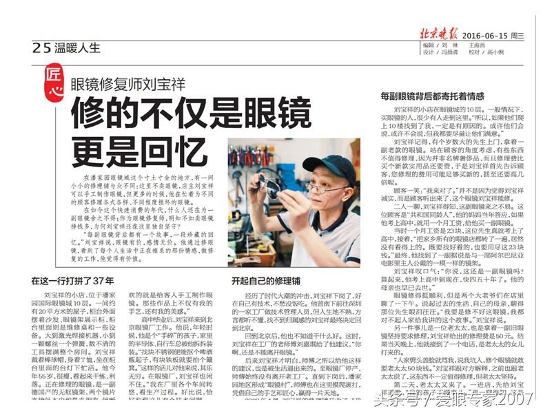 北京的刘宝祥师傅,从事眼镜工作三十余年,经验丰富,在北京有自己的修理店铺,经营十几年为国内外顾客维修了非常非常多的眼镜,修复的不光是眼镜,还延续了眼镜当中承载的那些属于眼镜主人的故事、经历。欢迎有需要的顾客前来。
