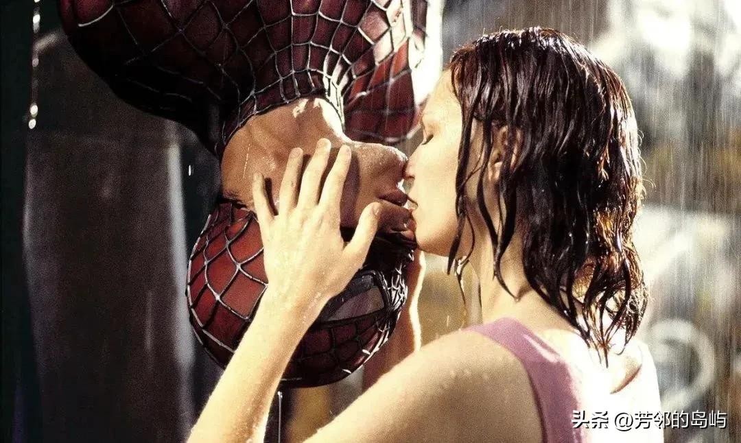 老《蜘蛛侠》三部曲里的托比·马奎尔和邓斯特,雨中浪漫的倒挂之吻……