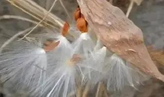 嫩时翠绿,渐长泛黄变成土一样的颜色,果实风干之后,裸露出棕褐色的种子,扁扁平平,头上有一束白毛,也会随风飘落,也能四处游荡。