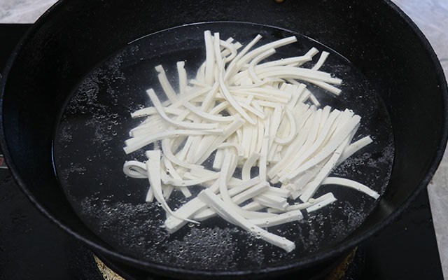第一步:准备一块嫩豆腐,切成片后改刀切成丝,冷水下入锅中;鸭血、胡萝卜、木耳均改刀切成丝,切好后一起放入锅中。往锅中加入少许盐、生抽、料酒,搅匀后大火烧开,然后用漏勺捞出来控干水分备用。