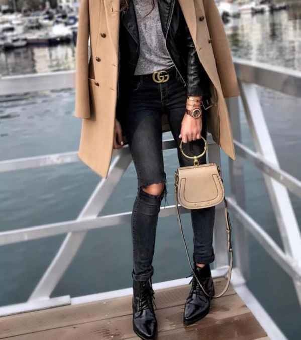 气温还较冷的北方城市,不妨延续秋冬流行的穿搭法,外套一件大衣,把机车夹克当做一件帅气的内搭来穿。