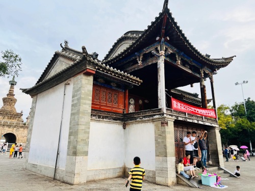西塔,也称官渡大钟楼,建于明朝,是官渡古城的另一座古塔。西塔高约23.8米,全塔由木结构搭建而成,塔顶悬吊着一口大钟,是古城的重要钟楼,也是官渡古镇的地标之一。