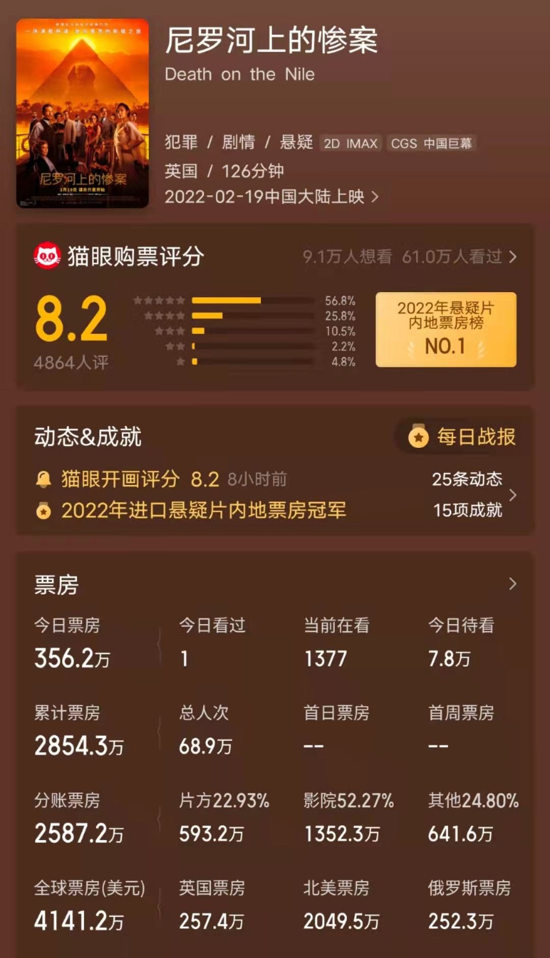 作为推理女王阿加莎·克里斯蒂的经典悬疑小说的影视化作品,《尼罗河上的惨案》不负众望,在猫眼取得了8.2的评分,看过的观众们纷纷在评论区留言称赞影片。