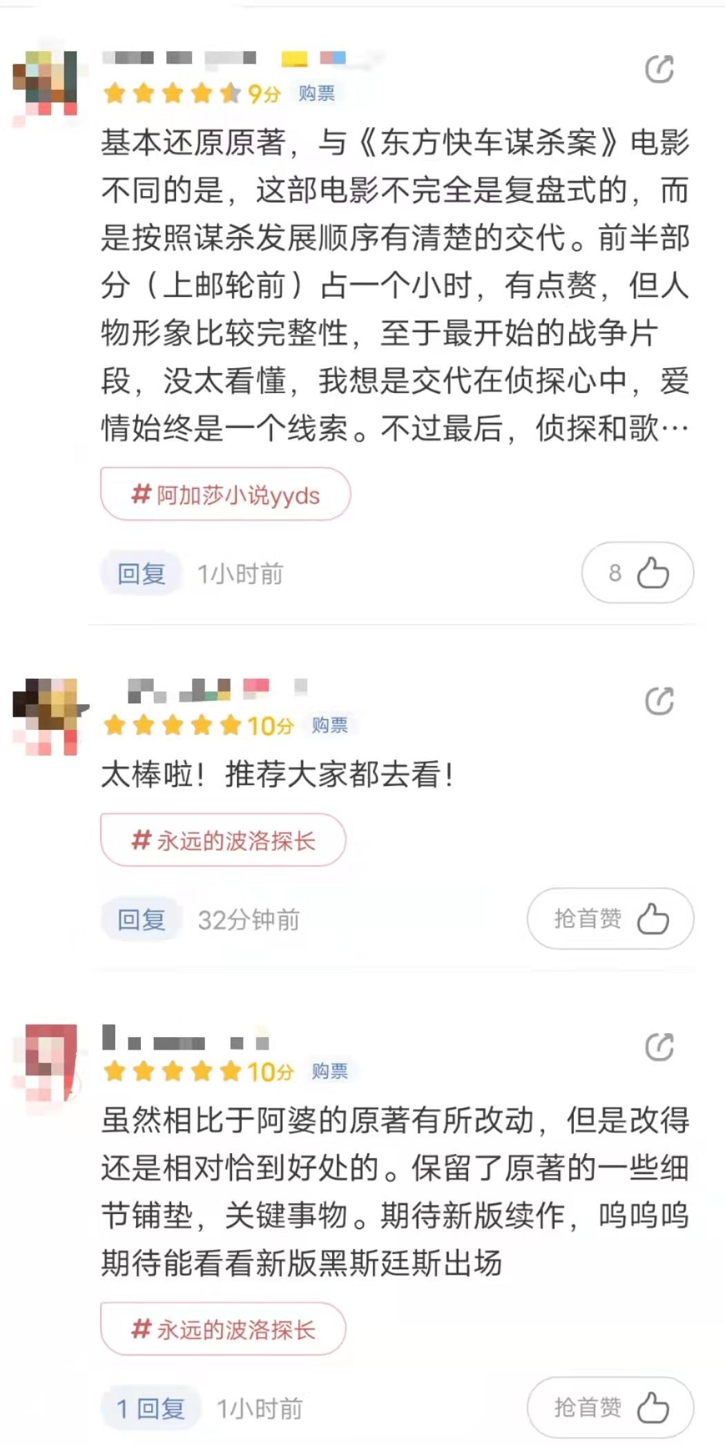 有的网友指出影片几乎还原了阿加莎·克里斯蒂的原著小说,虽然在某些地方有所改动,却无伤大雅,保留了原著中的一些精华。