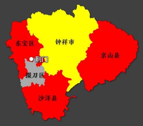 2016年末,辖1个街道、15个镇、1个乡:郢中街道、洋梓镇、长寿镇、丰乐镇、胡集镇、双河镇、磷矿镇、文集镇、冷水镇、石牌镇、旧口镇、柴湖镇、长滩镇、东桥镇、客店镇、张集镇、九里回族乡。市政府驻郢中街道