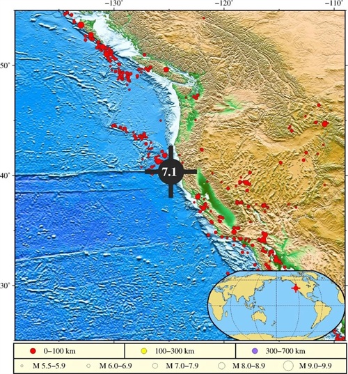 地震发生后,美国国家海啸预警中心发布加州北部海岸沿线地区海啸警报,范围包括加利福尼亚州和俄勒冈州的沿海地区。