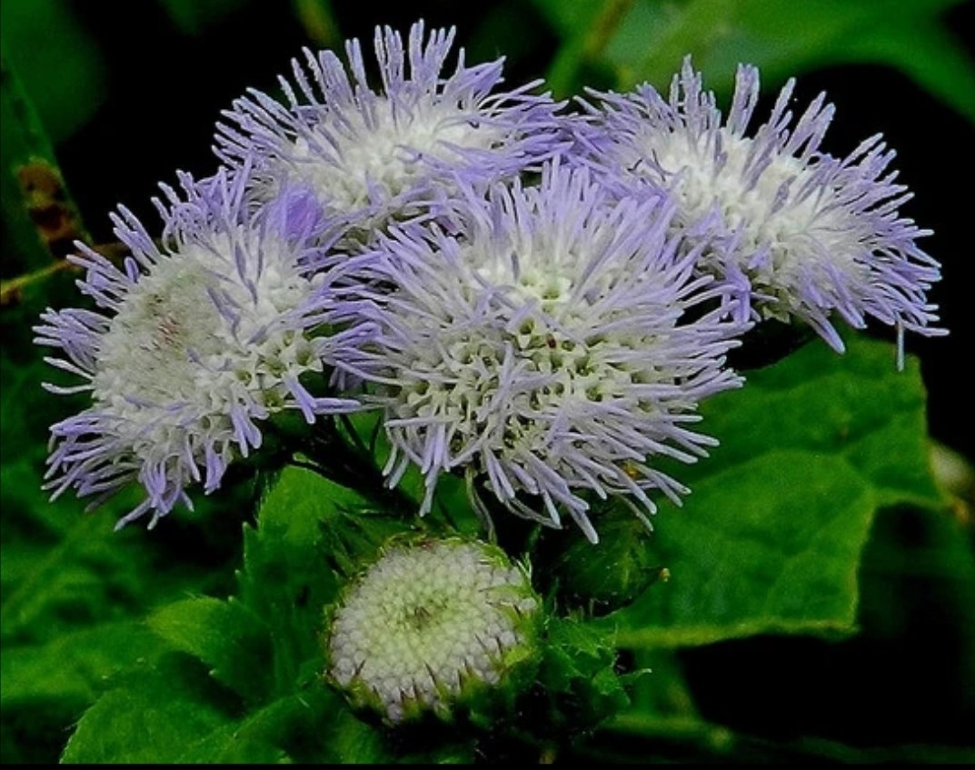 藿香蓟,别名有臭草、胜红蓟、白花草、重阳草、浓泡草、臭炉草、水丁药等,学名为Ageratum conyzoides Linn.;是菊科管状花亚科泽兰族藿香蓟属一年生草本植物;高度10-100公分,没有明显主根;茎粗壮,基部粗4公分左右,不分枝或自基部或自中部以上分枝,或下基部平卧节上生根;全部茎枝淡红色,或上部绿色,表面有毛。